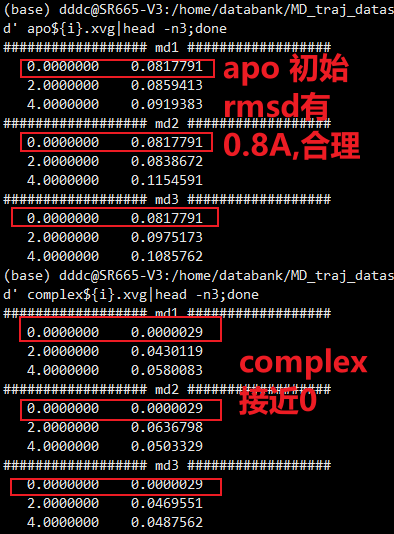 - # 初步检查 apo 和 complex 轨迹前几帧的rmsd,理论上,因为参考构象是complex初始结构,complex应该是0。测试得到的结果显示,complex接近0,apo不是0(如下图)