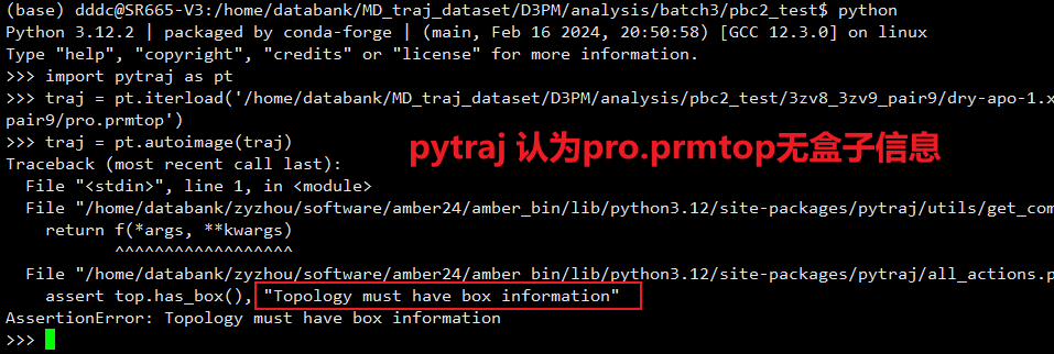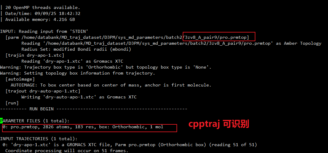 其中 autoimage 是外接bash 脚本实现的,pytraj autoimage 在测试中报错,找不到盒子信息,加上其读取轨迹速度慢,暂不使用pytraj autoimage。