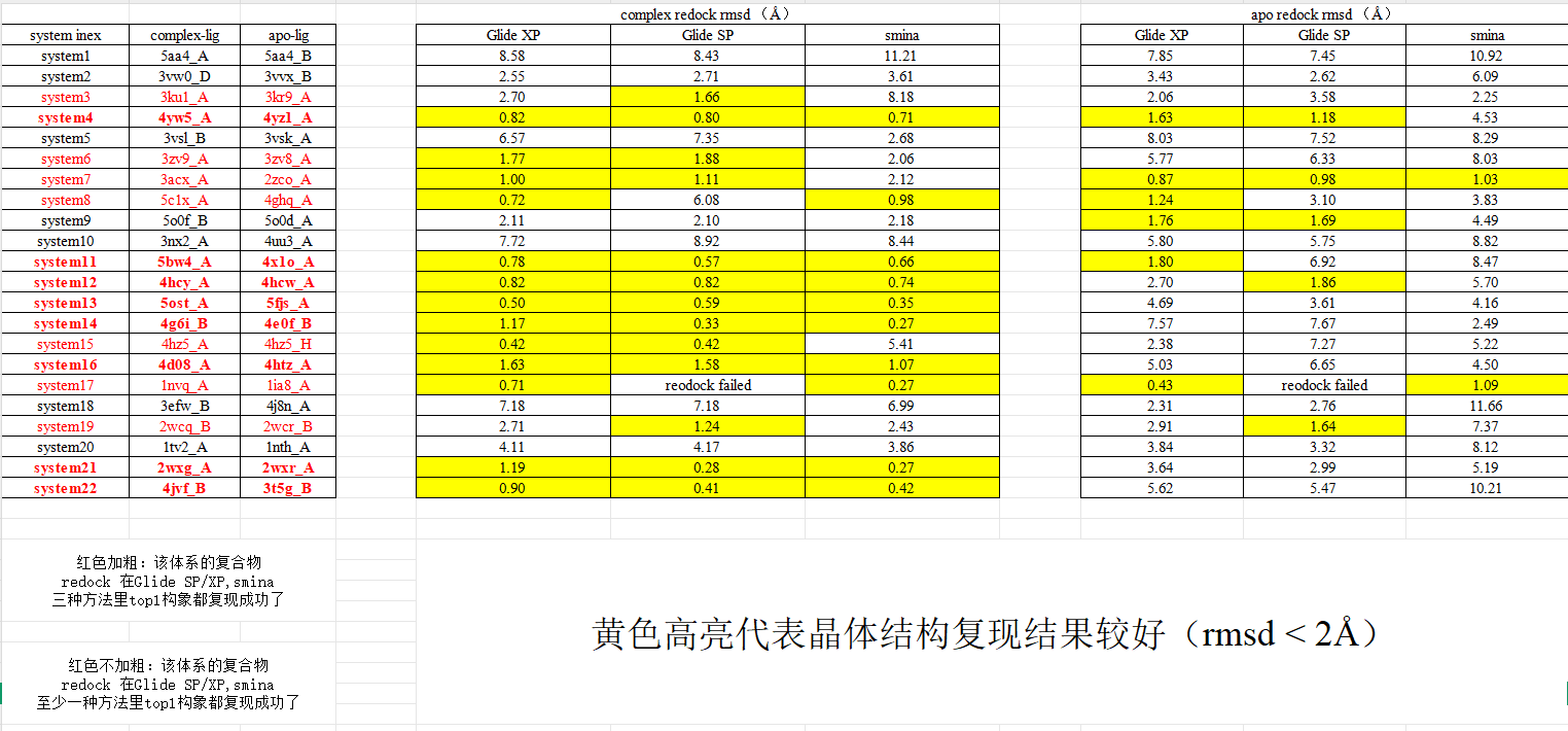 - 完成glide SP/XP/smina 三种方法的redock 与 rmsd计算