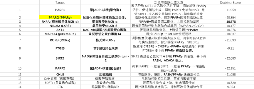 关注筛选结果与调脂肪分化因子(PPARγ、C/EBPα)以及相关脂肪合成酶(FASN、ACACA)有关靶点,如下有14个: