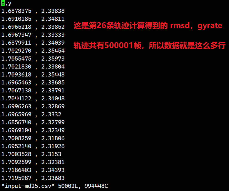 对rmsd和gyrate的输出文件xvg进行文本处理。整理为FEL 数据点的 x,y 轴数据(此时距离这些数据成为绘制FEL的输入数据还差根据玻尔兹曼分布reweighting 源自高温副本的数据到300k)