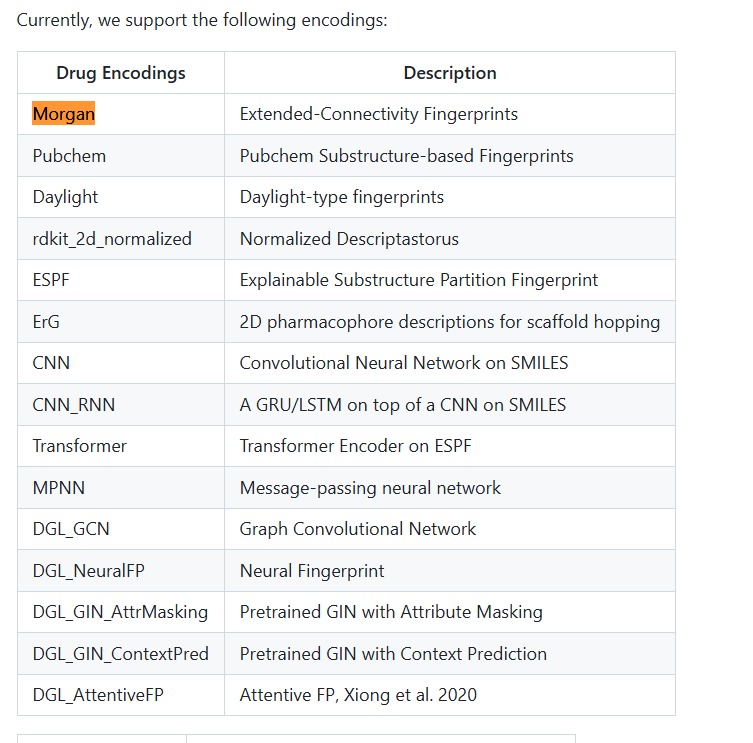 - encoder:编码器,支持多种编码方式,详见 kexinhuang12345/DeepPurpose: A Deep Learning Toolkit for DTI, Drug Property, PPI, DDI, Protein Function Prediction (Bioinformatics)